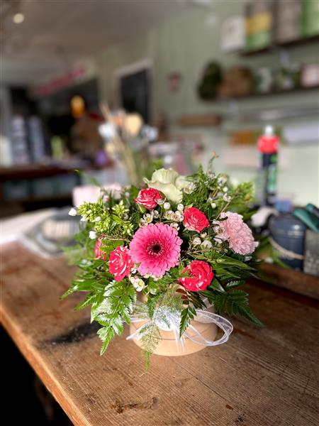 Gorgeous arrangement in pinks and whites in one of our hat boxes.