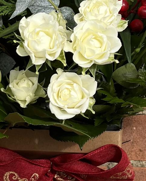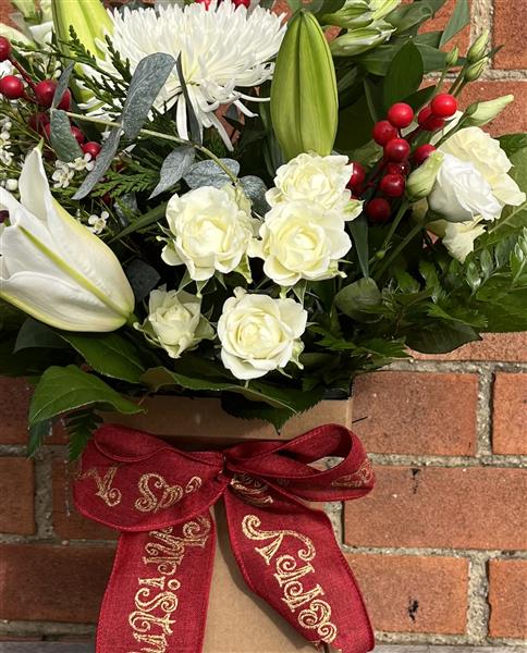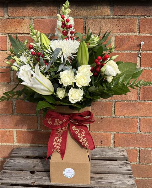 A classic, Christmas hand-tied arrangement in one of our eco friendly boxes, mostly whites flowers with a touch of reds.