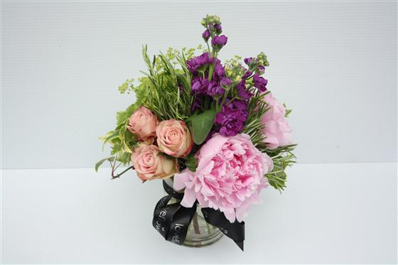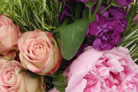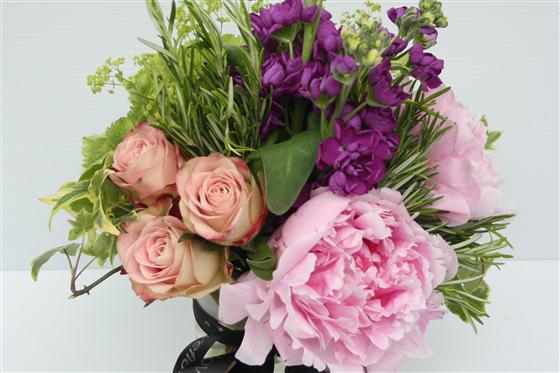 A dainty, summer bunch of peonies, scented stocks and roses with rosemary.